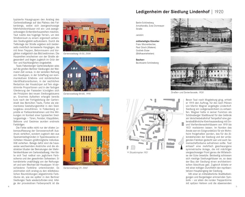 Bruno Taut (1880–1938) est généralement considéré comme le plus grand architecte de cités d'habitation de l'ère moderne. En utilisant les techniques architecturales les plus récentes et en se concentrant sur les besoins des personnes qui allaient habiter ses créations, il a marqué durablement la construction de logements de son époque, et pas seulement en raison du nombre impressionnant de 10 000 appartements. Cette publication rend hommage à l’une des personnalités les plus marquantes du XXe siècle. Elle présente le catalogue exhaustif des œuvres de Bruno Taut, parmi lesquelles figurent les célèbres lotissements berlinois tels que la « Hufeisensiedlung » (« Lotissement en fer à cheval »), la cité-jardin de Falkenberg « Tuschkastensiedlung » (surnommée la « Colonie des boîtes de peinture ») et le lotissement boisé « Onkel Toms Hütte » (« La Cabane de l’Oncle Tom ») . Chaque projet est présenté à l’aide de textes, de plans ainsi que de photos historiques et contemporaines. Des experts reconnus guident le lecteur à travers l’œuvre créative et la vie de Bruno Taut, montrant dans plusieurs essais introductifs qu’il n’était pas seulement un urbaniste, un designer et un réformateur social, mais aussi et surtout un artiste – et qu’il méritait donc pleinement d’être honoré comme « maître de l’architecture colorée ».